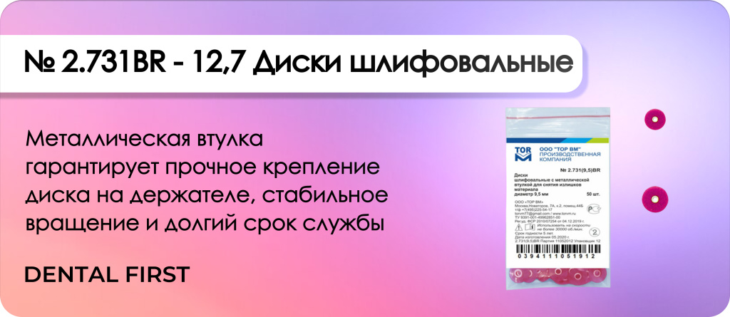 Диски шлифовальные с металлической втулкой № 2.731BR - 12,7 от компании ТорВм - это специализированный инструмент для эффективного и аккуратного снятия излишков стоматологических материалов. Они обеспечивают удобство работы и высокую точность обработки в клинике, а металлическая втулка гарантирует надежное крепление и безопасность при вращении.
