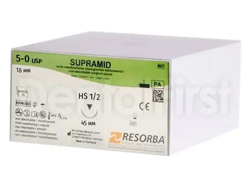 Надежное решение для точных и надежных швов Шовный материал Супрамид DSM 11, 0.7 EP 6-0 USP, 0.45 m от компании RESORBA - это cинтетическая нерассасывающаяся монофиламентная нить. Полиамидный материал, произведенный в результате поликонденсации аминокапроновой кислоты. Особенностью структуры является хаотичное расположение пучков монофиламентов внутри волокна, заключенных внутри турбки, образуемой специальным покрытием, что придает ему свойство монофиламентного материала с присущей монофиламентам гладкой поверхностью Технические характеристики Показания к применению Меры предосторожности Преимущества Инструкция по применению Комплектация Технические характеристики Нить: черная, (0,7 EP), 5-0 USP, 0.45м Игла: 11мм, обратно - режущая, 3/8 круга Структура: синтетический, псевдомонофиламентны Состав: полиамид (полимера гексаметилендиамина и адипиновой кислоты) Цвет: черный Абсорбация: нерассасывающийся Область применения: для ушивания кожи Показания к применению Шовный материал RESORBA предназначен для использования в различных хирургических процедурах, таких как: Швы после хирургических процедур. Закрытие ран и разрезов. Используется в стоматологии, хирургии и других областях медицины. Меры предосторожности Стерильность: Перед использованием убедитесь в том, что шовный материал находится в стерильной упаковке. Не использовать, если упаковка повреждена или не гарантирует стерильность. Хранение: Храните шовный материал в сухом и прохладном месте, избегая прямых солнечных лучей. Следуйте указаниям по хранению, предоставленным производителем. Стандартные Процедуры: Следуйте стандартным хирургическим процедурам и техникам при применении шовного материала. Убедитесь, что вы знакомы с правильной техникой шитья. Используйте только для предназначения: Шовный материал RESORBA предназначен для использования в хирургических процедурах, таких