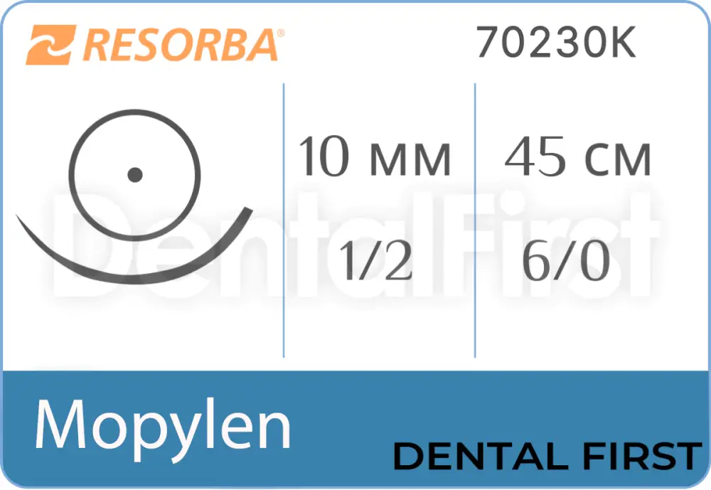 Шовный материал Мопилен HR 10, 0,7 EP 6-0 USP, 0.45 m. Синтетическая монофиламентная нерассасывающаяся нить. Специально разработанный монофиламентный полипропилен. Гидрофобная, устойчива к ферментам, полностью ареактивна. Колющая игла 1/2, 17мм. Голубой. Германия