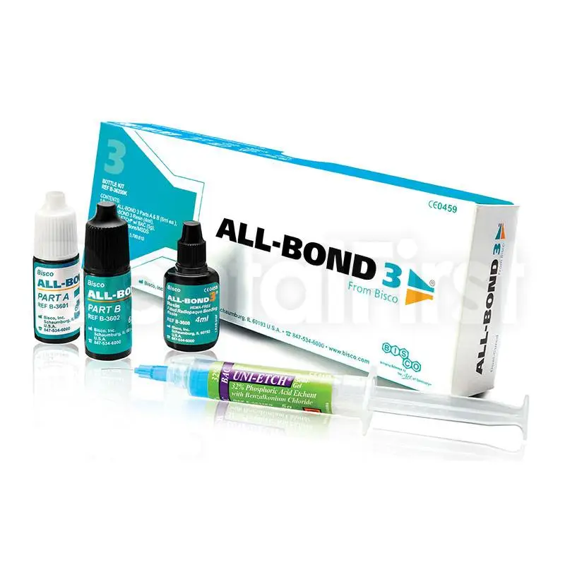 All-Bond 3 от компании Bisco - это универсальная адгезивная система двойного отверждения, совместимая со всеми видами стоматологических материалов. Обеспечивает надёжный бондинг благодаря гидрофобным мономерам в составе, которые уменьшают адсорбцию воды. Позволяет достичь высокого качества адгезии и широко применяется в стоматологической практике.