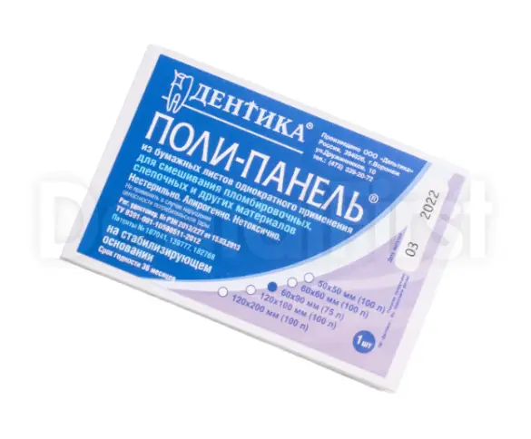 Поли-панели предназначены для смешивания на них пломбировочных, слепочных и других материалов. Поли-панели представляют собой клееный с двух, трёх или четырех торцов блок из листов бумаги, ламинированной с одной стороны, которая является рабочей и предназначена для смешивания компонентов. Производитель: ДЕЛЬТИКА, Россия.