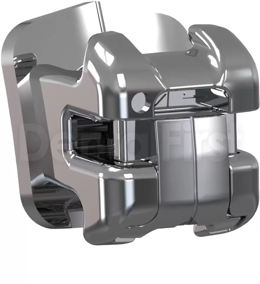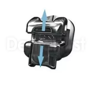 Брекет-замочек снабжен закрывающимся пазом-клипсой, в котором находится металлическая дуга, лигатуры уже не нужны.
