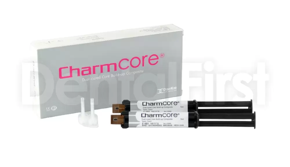 CharmCore – материал полимерный восстановительный тип 2, класс 3по ISO 4049 - композитная смола двойного отверждения: самоотверждение (происходит под действием химических агентов) и отверждение под воздействием внешних источников энергии.