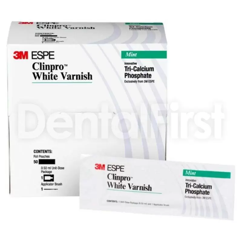 Clinpro White Varnish фторсодержащее покрытие с трикальцийфосфатом (50 штук; 0.5мл материала в блистерах и кисточкой для нанесения; 1 блокнот с инструкцией для пациента; 60 стикеров для дозирования материала)