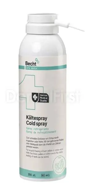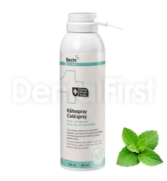 Cold Spray Mint от компании Becht - это высокоэффективный охлаждающий спрей, применяемый для проведения термодиагностики в стоматологической практике. Используется для тестирования жизнеспособности зубов путем кратковременного охлаждения. Подходит также для локального обезболивания кожи перед инъекциями, установкой катетеров и другими процедурами.