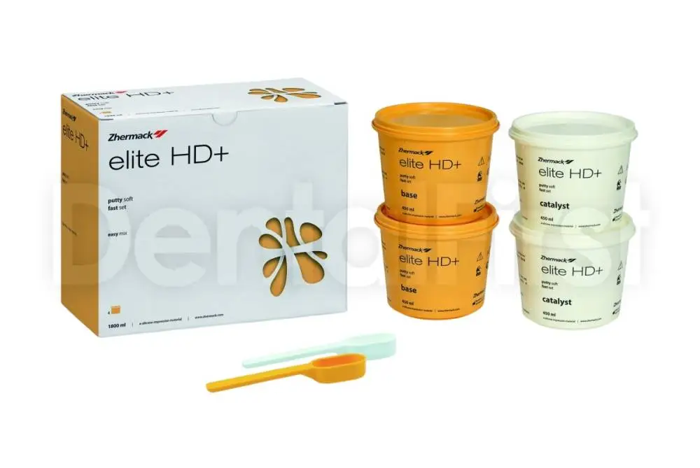 Elite HD+ Putty - это А-силикон для снятия первого (базового) оттиска. Подходит как для двухэтапной техники (двойной оттиск), так и для одноэтапной (одномоментный оттиск) техники. Гидросовместимый, превосходно распределяется по влажной поверхности, точно отображая рельеф. Тиксотропный, благодаря чему не стекает с места нанесения, но идеально распределяется и фиксирует мельчайшие детали. Не меняет форму после деформации при выведении из полости рта. Рекомендуется комбинировать с материалами HD+ Light Body, HD+ Regular Body или HD+ Super Light Body.