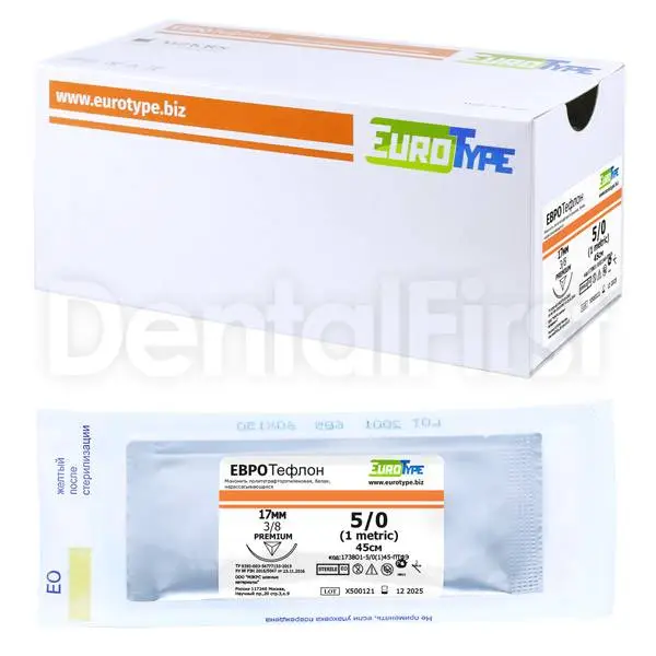 Евротефлон 5/0, 45мм, 17мм, обр. реж. 3/8 от компании EuroType - инновационный нерассасывающийся стерильный хирургический шовный материал. Нить монофиламентная (мононить). Изготовлена из политетрафторэтилена (ПТФЭ). Имеет идеально гладкую поверхность. Обладает высокой гибкостью и прочностью. Нить ПТФЭ химически инертная, биоинертная. Длительное время сохраняет свои свойства. Не теряет прочность и упругость, отлично держит узел. Игла атравматическая Premium из нержавеющей стали, обратно-режущая, 3/8 окружности. Высокое качество полировки и специальное соединение нити снижает вероятность травмирования сшиваемых тканей.