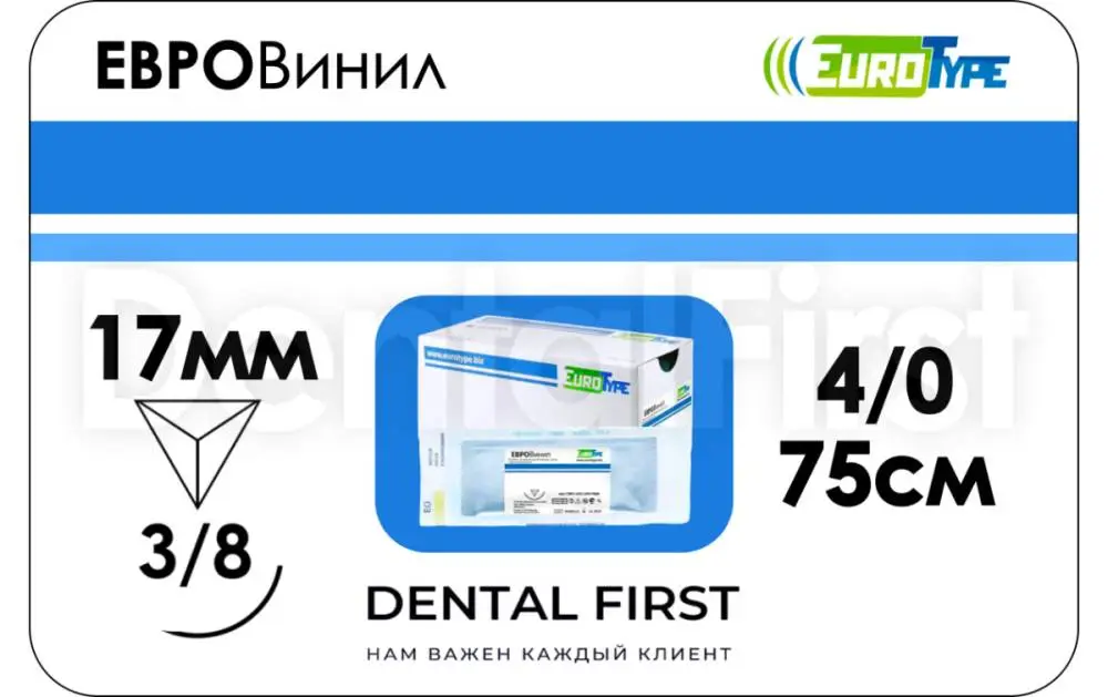 Евровинил 4/0, 75см, 17мм, О/Р 3/8от компании EuroType - инновационный нерассасывающийся стерильный хирургический шовный материал. Нить монофиламентная (мононить). Изготовлена из поливинилиденфторида (ПВДФ). Имеет идеально гладкую поверхность. Обладает очень высокой эластичностью и мягкостью, даже по сравнению с нитями из полипропилена. Нить ПВДФ химически инертная, биоинертная, не врастает в окружающие ткани, при необходимости легко удаляется простым вытягиванием. Может находиться в организме неограниченное время. Не теряет прочность и упругость, отлично держит узел. Для лучшей идентификации окрашена в синий цвет. Игла атравматическая Premium из нержавеющей стали, обратно-режущая, 3/5 окружности. Высокое качество полировки и специальное соединение нити снижает вероятность травмирования сшиваемых тканей.