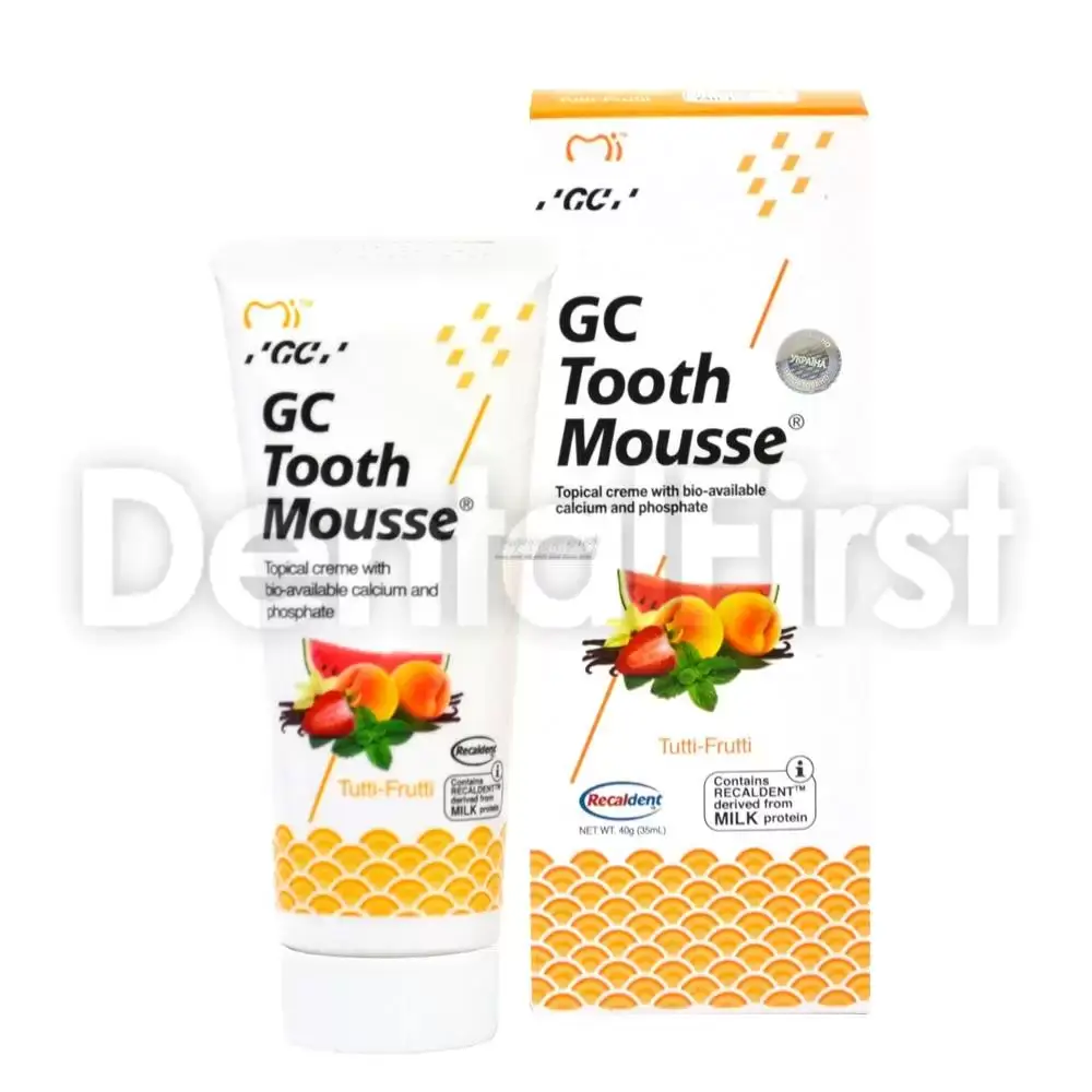 ДЖИ СИ Мусс тути-фрути для Зубов - реминерализирующий, водорастворимый стоматологический крем без сахара, в состав которого входит Recaldent CPP-ACP (Казеин Фосфопептид - Аморфный Кальций Фосфат).