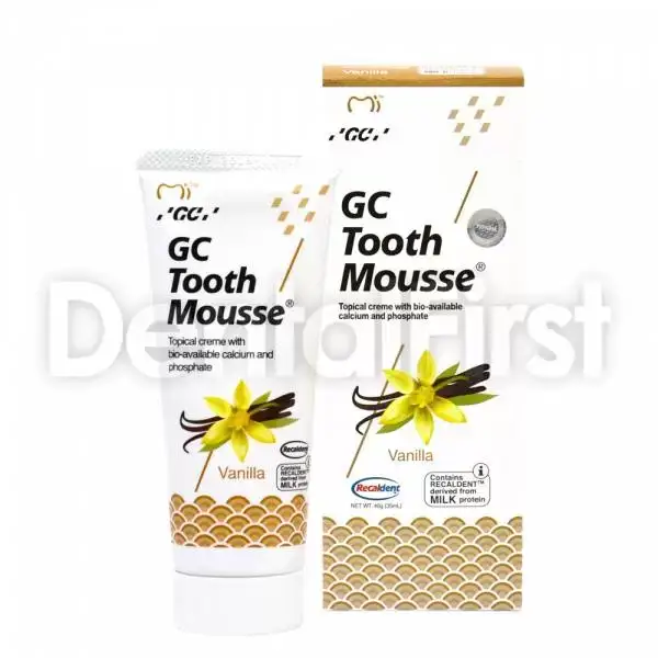 ДЖИ СИ Мусс ваниль для Зубов - реминерализирующий, водорастворимый стоматологический крем без сахара, в состав которого входит Recaldent CPP-ACP (Казеин Фосфопептид - Аморфный Кальций Фосфат).