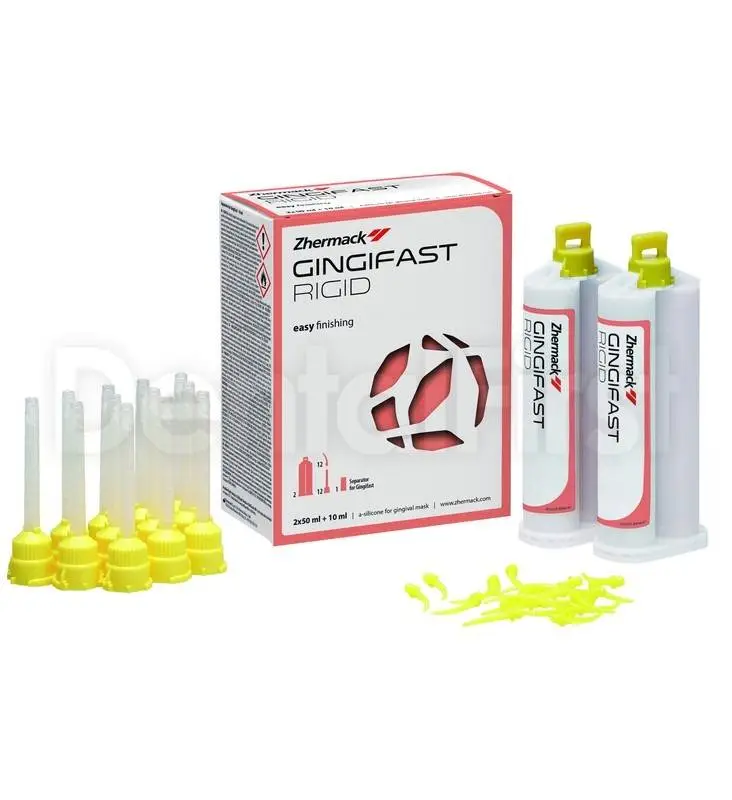Материал стоматологический слепочный Gingifast Rigid - твердый А-Силикон для воспроизведения десны на модели. В составе: 2 картириджа емкостью 50 мл + 1 флакон Separator Gingifast объемом 10 мл, а также 12 желтых смесительных наконечников и 12 желтых интраоральных канюль.