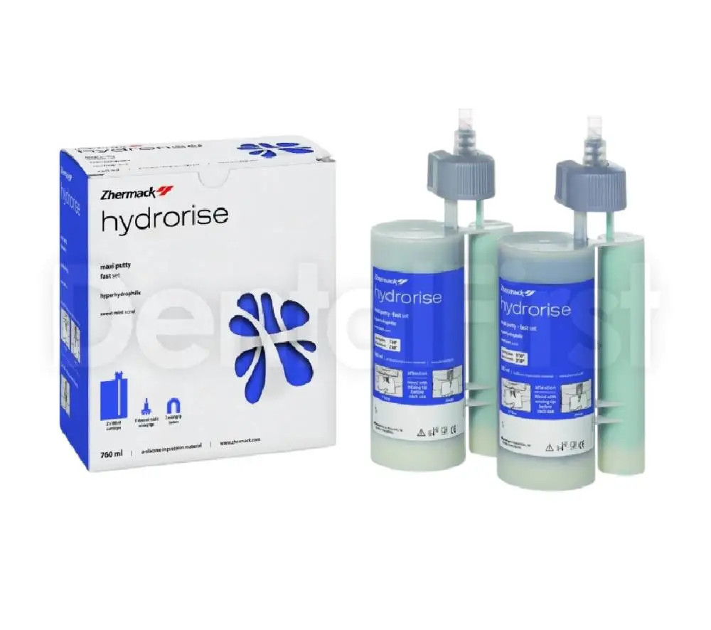 Hydrorise Maxi Putty Fast Set А-силикон очень высокой вязкости, в упаковке для автоматических смесителей 5:1. Поливинилсилоксан для первого оттиска с эластичной конечной консистенцией, рекомендуемый для всех видов техники снятия слепка: для двухэтапной техники (двойной оттиск) или для одного этапа (одновременный). Материал позволяет комбинировать различные вязкости для каждой конкретной ситуации с диапазоном времени схватывания для любой процедуры оттиска. Высокая эффективность обусловлена технологией, называемой Гипергидросовместимость. Эта способность позволяет повышать текучесть силикона для значительного улучшения четкости оттиска.