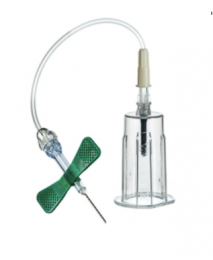 Игла-бабочка с держателем для флаконов для гемокультур. Держатель совместим с флаконами BacT/ALERT (BioMerieux), а также совместим с большинством типов флаконов для бактериологических анализаторов (диаметр крышки флакона 12-20 мм, диаметр горлышка 17-32 мм) и вакуумными пробирками стандартных размеров. Таким образом во время одной венепункции можно взять кровь в флакон для гемокультур и в вакуумную пробирку.