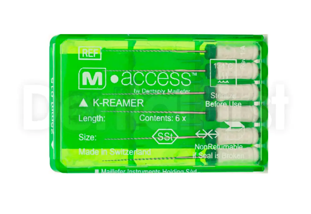 K-Reamer M-ACCESS от компании Dentsply Sirona - ручной каналорасширитель из нержавеющей стали, предназначенный для эффективного прохождения и формирования корневых каналов. Отличается удобством работы, надежностью и соответствием ISO-кодировке благодаря цветным ручкам. Силиконовые стопперы обеспечивают контроль рабочей длины и безопасность манипуляций. Инструмент имеет увеличенный шаг режущих граней, обеспечивающий высокую проходимость, гибкость и режущую эффективность при извлечении.