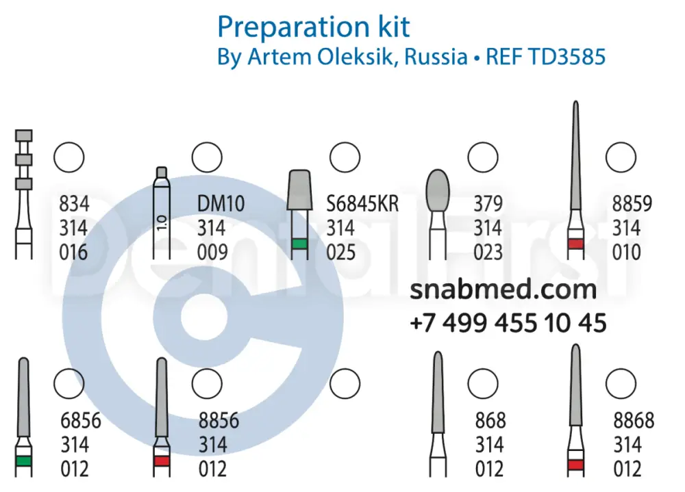 Набор TD3585 от Komet Dental - это профессиональный комплект бор-фрез, разработанный в сотрудничестве с доктором Артемом Олексиком, признанным специалистом в области препарирования под виниры и коронки. Подходит для использования в эстетической стоматологии, ортопедии и терапевтической практике.