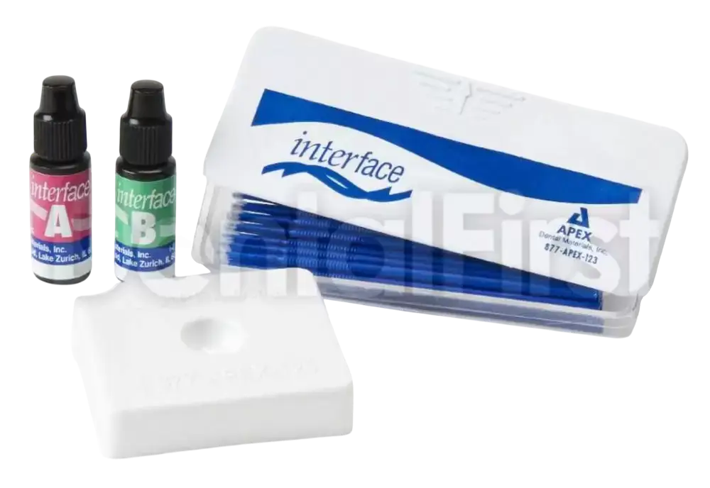 Материал Interface (Интерфейс) представляет собой революционный керамический праймер, который позволяет врачу соединять любой тип керамики с зубом или композитом, включая новые высокопрочные материалы. С помощью материала Interface можно установить или отремонтировать, не снимая, любой керамический протез без использования опасной плавиковой кислоты. Материал готовится непосредственно перед использованием, его срок хранения составляет 3 года с даты выпуска. Инновационный материал Interface может быть использован для подготовки керамики, дентина и эмали ОДНОВРЕМЕННО.