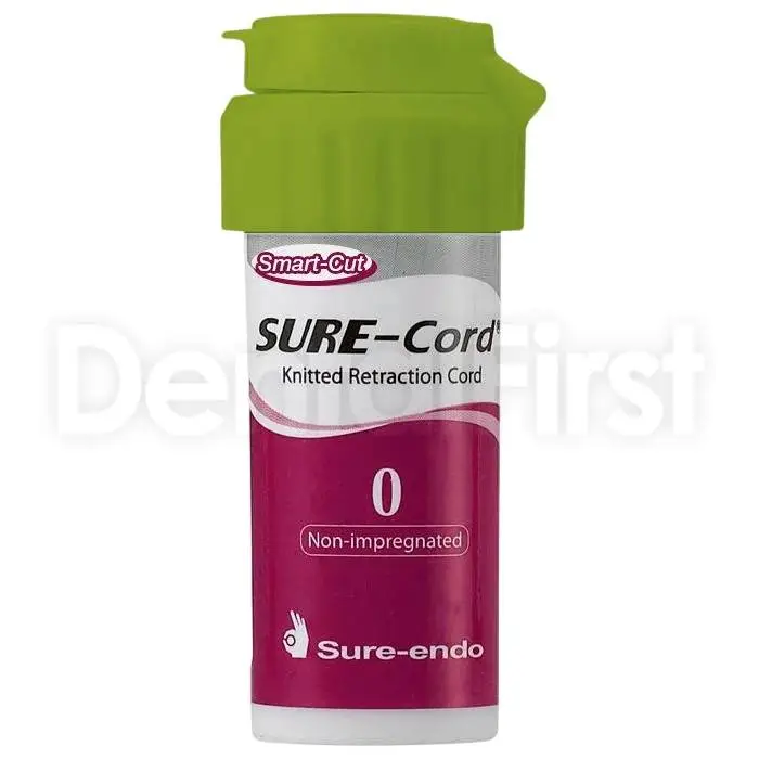 Ретракционная нитка Sure-Cord изготовлена из 100-процентного хлопка; вязаные петли нити, которые в свою очередь переплетаются между собой, способны поглощать значительно большее количество гемостатического раствора, а также служат отличным средством доставки в операционное поле препаратов в форме геля; обладает большей абсорбирующей способностью, чем крученые или плетеные нити; во время препарирования вязаная нить не наматывается на алмазный бор; идеально подходит для ретракции десны и легко пакуется в зубодесневую бороздку. Обрезчик нити: керамический лезвие внутри колпачка; отрезает нить автоматически при закрытии контейнера колпачком; удерживает конец нити в колпачке, благодаря чему она не падает вовнутрь контейнера после отрезания; предотвращает перекрестное инфицирование.