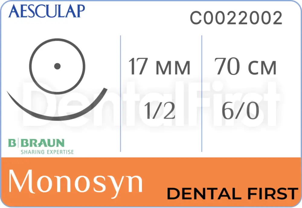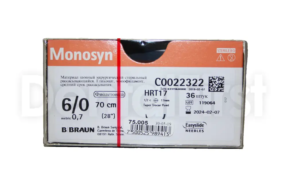 Моносин фиолетовый 6/0 (0,7) 70 см HR17, C0022002, (Bbraun) - синтетическая монофиламентная нить со средним сроком рассасывания на основе гликоната. Для лучшей визуализации при работе в глубине раны нить Monosyn имеет фиолетовый цвет. Она позволяет осуществлять надежную поддержку мягких тканей на протяжении всего периода заживления.