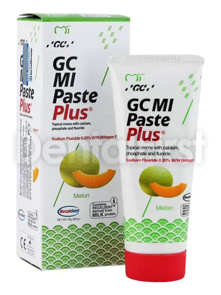 Паста GC mi paste plus с дыней - революционный продукт компании GC с уникальным веществом Recaldent, в состав входит фосфопротеин казеин, полученный из молочного протеина. Он обволакивает зубы и снабжает их ионами биодоступных кальция и фосфата, улучшая защиту от воздействия кислот и делая их прочнее и выносливее. Приятный вкус способствует образованию слюны, повышающей эффективность процесса. Стоматологический крем помогает предотвратить и затормозить развитие кариеса. Использовать рекомендуется при нарушении минерального баланса, повреждении твердых тканей, усилении чувствительности зубов.