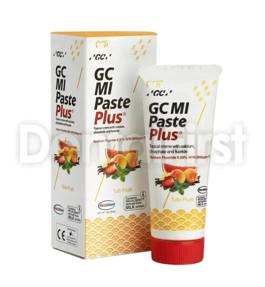 Паста GC mi paste plus с мультифруктом - революционный продукт компании GC с уникальным веществом Recaldent, в состав входит фосфопротеин казеин, полученный из молочного протеина. Он обволакивает зубы и снабжает их ионами биодоступных кальция и фосфата, улучшая защиту от воздействия кислот и делая их прочнее и выносливее. Приятный вкус способствует образованию слюны, повышающей эффективность процесса. Стоматологический крем помогает предотвратить и затормозить развитие кариеса. Использовать рекомендуется при нарушении минерального баланса, повреждении твердых тканей, усилении чувствительности зубов.