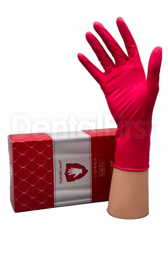 Перчатки медицинские смотровые нитриловые, неопудренные, гипоаллергенные, нестерильные. Текстурированная поверхность на пальцах, цвет красный, форма плоская, манжета с валиком.