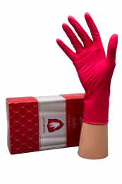 Перчатки медицинские смотровые нитриловые, неопудренные, гипоаллергенные, нестерильные. Текстурированная поверхность на пальцах, цвет красный, форма плоская, манжета с валиком.