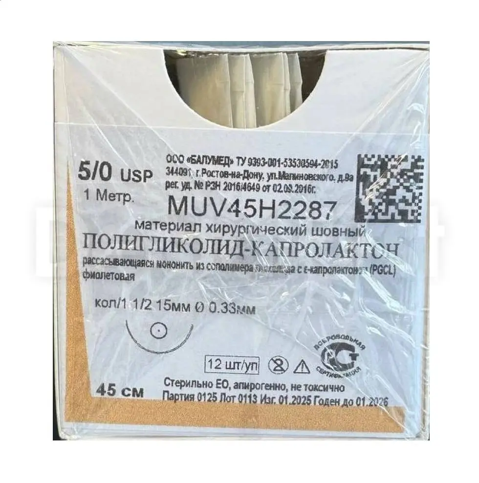 Полигликолид-капролактон мононить расс.,фиолет.,USP 5-0 (М1),45см,кол/1,1/2,15мм,0,33мм
