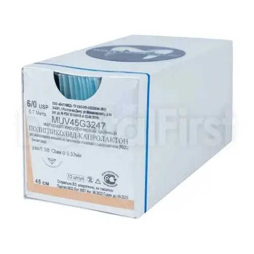 2620 ₽ Бонус: 26.20 руб. Полигликолид-капролактон мононить расс., фиолет., USP 6-0 (М0,7), 45см, реж/1, 3/8,12мм