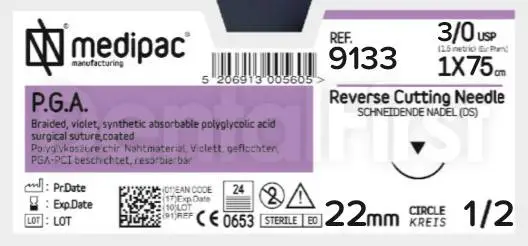 Полигликолиевая кислота (PGA) (аналог Vicryl) — Плетёная фиолетовая синтетическая рассасывающаяся нить из полигликолевой кислоты, покрытая кополимером PDA-PCI