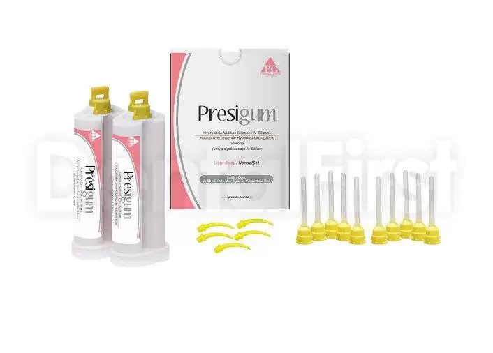 Presigum А-силикон - слепочный материал высокого качества гарантирует большую точность отображения. винилполисилоксановый оттискной материал сочетает в себе впечатляющие свойства с максимальной простотой использования, гарантирует точность воспроизведения поддесневых областей . Оттискная масса имеет отличные гидрофильные свойства, хорошую размерную стабильность, прекрасно восстанавливается после деформации, легко извлекается из полости рта, идеально воспроизводит мельчайшие детали. Применяется для различных техник снятия оттисков в любых клинических ситуациях.