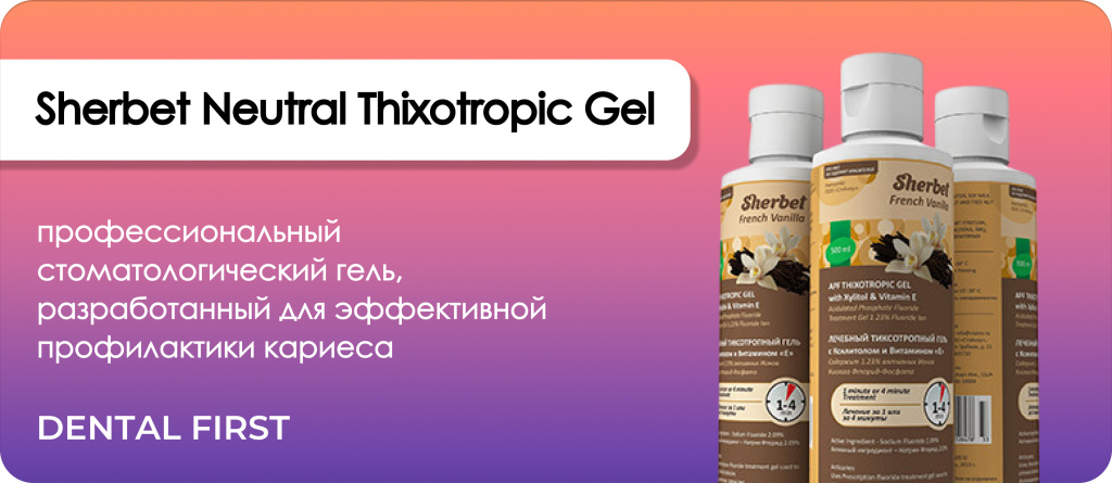 Sherbet Neutral Thixotropic Gel - профессиональный стоматологический гель, разработанный для эффективной профилактики кариеса и снижения чувствительности зубов. Содержит высокую концентрацию ионов фтора (2%, или 9000 ppm), что делает его особенно мощным средством для реминерализации эмали и защиты от патогенных микроорганизмов.