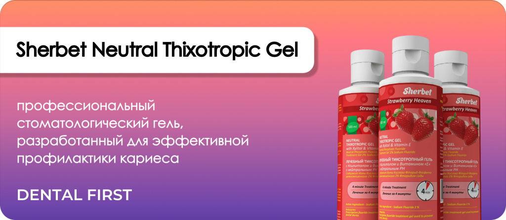 Sherbet Neutral Thixotropic Gel - профессиональный стоматологический гель, разработанный для эффективной профилактики кариеса и снижения чувствительности зубов. Содержит высокую концентрацию ионов фтора (2%, или 9000 ppm), что делает его особенно мощным средством для реминерализации эмали и защиты от патогенных микроорганизмов.