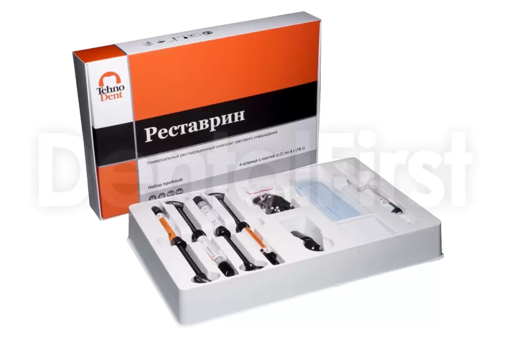 Реставрин набор пробный (4 шприца) Композитная паста: А2, А3, А3.5, В2, С2, ОА2; адгезив, гель для травления. Наногибридный композит светового отверждения для постоянных реставраций