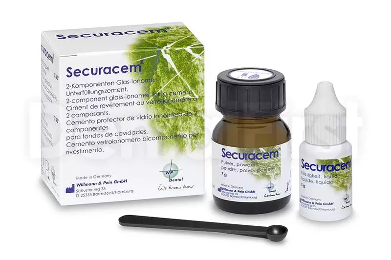 Securacem - двухкомпонентный стеклоиномерный цемент, разработанный специально в качестве прокладочного материала. Обладает хорошей адгезией к дентину и высвобождает фториды, может использоваться со всеми видами пломбировочных материалов.