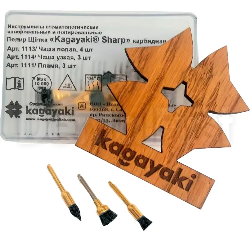 Используя щетки Kagayaki Sharp, можно быстро придавать керамике, композитам и стеклоиономерным материалам зеркальный блеск.
