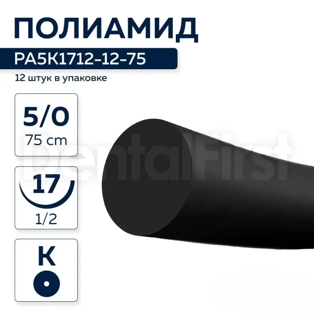 Шовный материал Полиамид NA 5/0 mono K 17 mm 1/2 75 cm (12 шт) чёрная нить