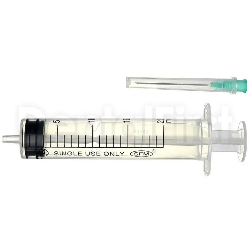 Трехкомпонентный шприц 20мл, индивидуально упакован в блистер, игла лежит рядом. Шприц имеет плавный ход поршня за счёт резиновой манжеты на поршне. Стальная игла inox AISI 304 тройной степени заточки с