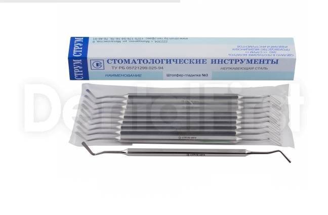 Гладилка комбинированная со штопфером №3, производства Белорусь. Для внесения прокладок, пломбировочного материала в полости зуба и уплотнения пломбы. Снабжена практичной шестигранной ручкой, заканчивающейся направленными в противоположные стороны штопфером и гладилкой.