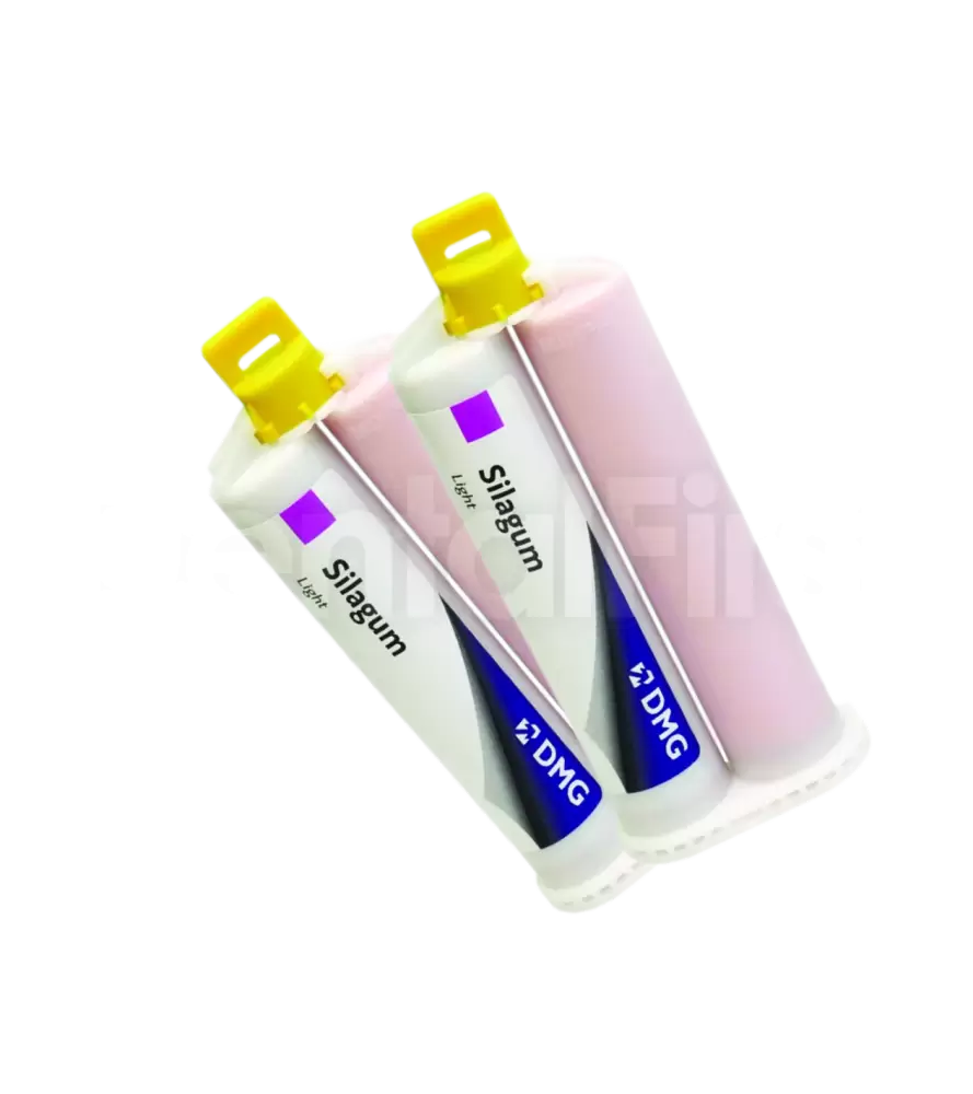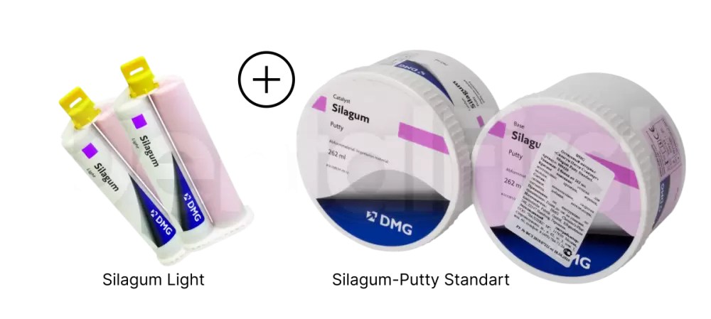 Silagum Light (Силагум лайт) – популярный слепочный материал для корригирующих оттисков. Основой материала является силикон А-типа. А-силикон обладает множеством преимуществ и позволяет создавать очень точные оттиски, подверженные минимальной усадке и деформации. Silagum Light подходит для всех техник двухфазного оттиска. В комплекте два картриджа по 50 миллилитров (2х50 мл). Также, в комплект поставки входят насадки Automix-Tip, и насадки Intraoral-Tip.