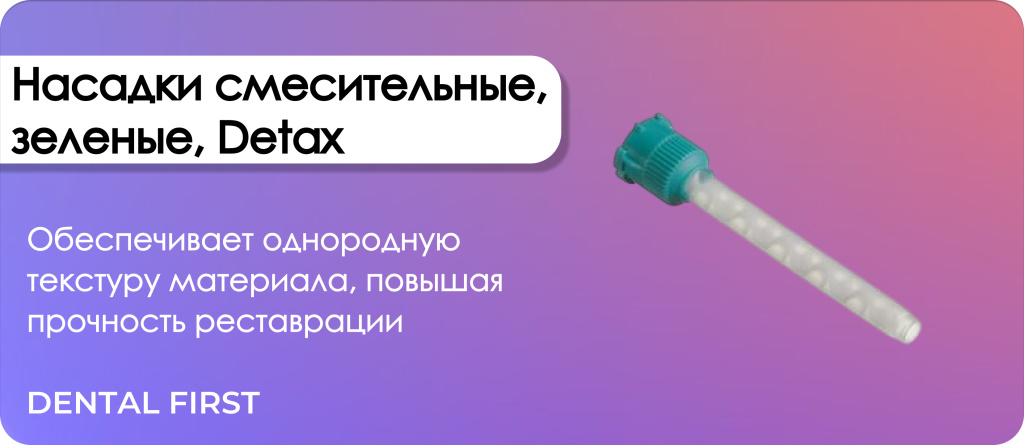Насадки смесительные зеленые Detax – это качественные смесительные канюли от немецкой компании Detax. Основное назначение – использование с диспенсерами для точного смешивания материалов при изготовлении временных коронок. Эти насадки обеспечивают надежное и равномерное смешивание, что делает процесс более эффективным и чистым.