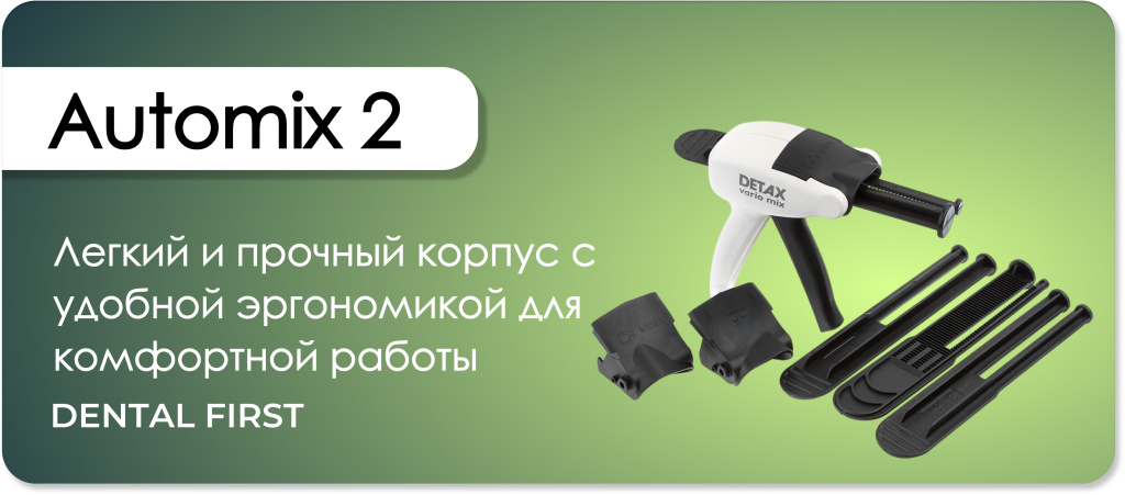 Automix 2 от немецкого производителя DETAX - профессиональный смесительный пистолет для автоматического смешивания и дозирования стоматологических материалов. Устройство поддерживает несколько режимов смешивания (1:1, 2:1, 4:1 и 10:1), что делает его универсальным инструментом для различных клинических задач.