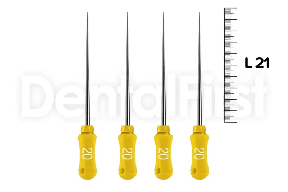 ! Инструмент для работы техникой латеральной конденсации, предусматривающей внесение основного гуттаперчивого штифта, утрамбовывание его в боковом направлении и заполнение канала дополнительными штифтами.