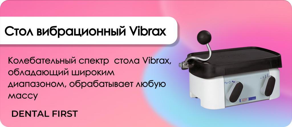 Вибрационный стол Vibrax от производителя Renfert - это профессиональное оборудование для равномерной обработки любых формовочных масс в зуботехнической лаборатории. От производителя стол оснащен мощным, но бесшумным мотором с широким колебательным спектром, позволяющим добиться высокой текучести без образования пузырьков. Интуитивное управление, устойчивый корпус и удобная накладка делают Vibrax оптимальным решением для точной заливки и паковки оттисков даже в условиях интенсивной нагрузки.