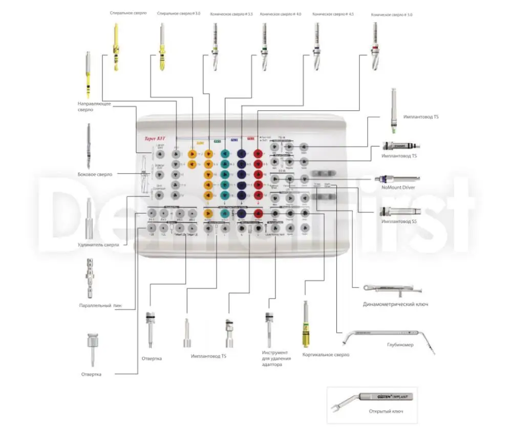Taper Kit от производителя OSSTEM - это базовый хирургический набор, предназначенный для установки имплантатов конусной формы. Комплект оптимизирован для систем имплантации Osstem и обеспечивает удобный и быстрый хирургический протокол благодаря продуманной компоновке и универсальности инструментов.
