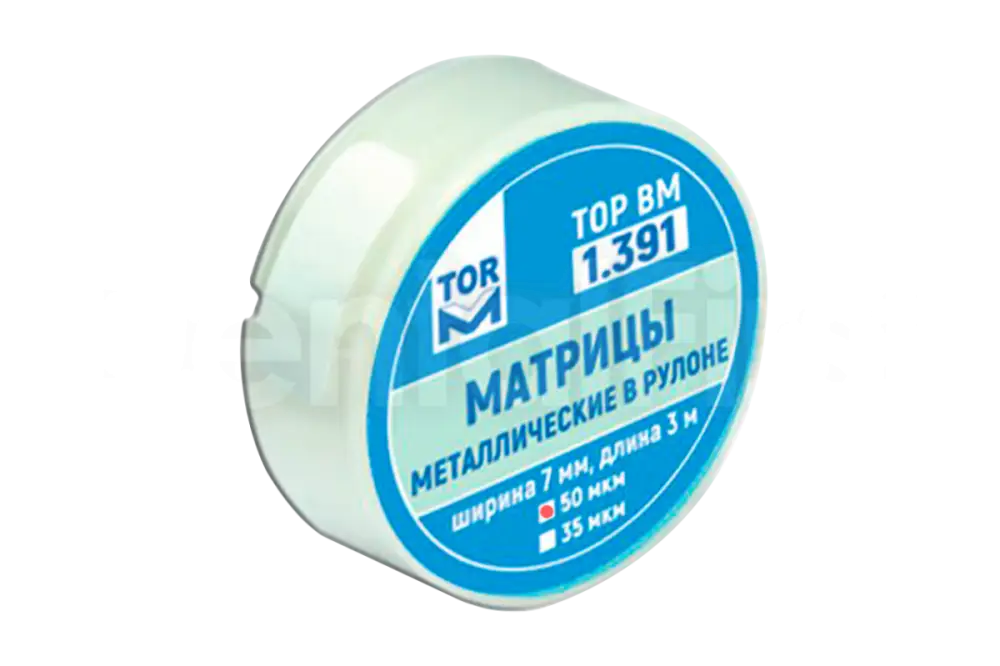 Матрицы 1.391 металлические в рулоне, ширина 7 мм, длина 3 м, толщина 50 мкм. Круглая упаковка диаметром 32 мм.