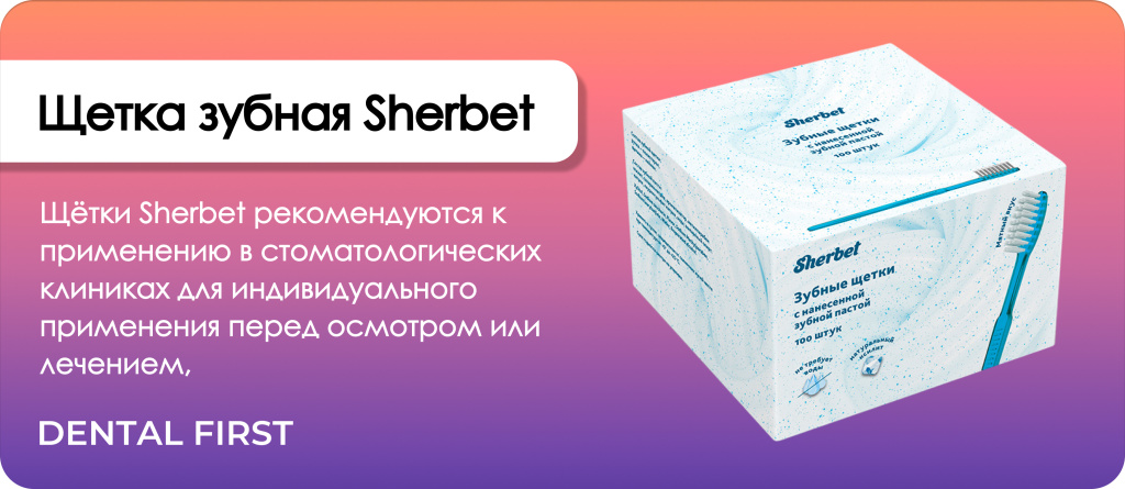 - Зубные щётки Sherbet рекомендуются к применению в стоматологических клиниках для индивидуального применения перед осмотром или лечением, в гостиницах, а также в повседневной жизни – для чистки зубов дома и в офисе, в поездке, после приёма пищи или перед важной встречей.