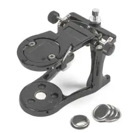 Окклюдатор зуботехнический для установки моделей зубных протезов ОК 3-ММИЗ. Предназначен для фиксирования моделей в положении центральной окклюзии, воспроизведения имитации движений открывания и закрывания рта и осуществления постановки искусст